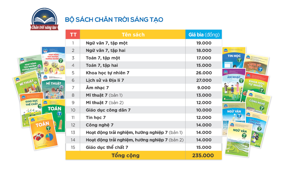 Bộ sách giáo khoa lớp 7 “Chân Trời Sáng Tạo” là một trong những tài liệu học tập được nhiều phụ huynh và học sinh tin tưởng lựa chọn. Với 12 cuốn sách, bộ sách này không chỉ đầy đủ các môn học như Toán, Ngữ Văn, Tiếng Anh mà còn có cả Âm Nhạc. Giá sách tương đối hợp lý, dao động từ 17.000 đến 19.000 đồng cho mỗi cuốn, giúp phụ huynh dễ dàng tiếp cận.